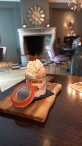 2 bollen vanille ijs met mini marshmallows, slagroom en aardbeiensaus